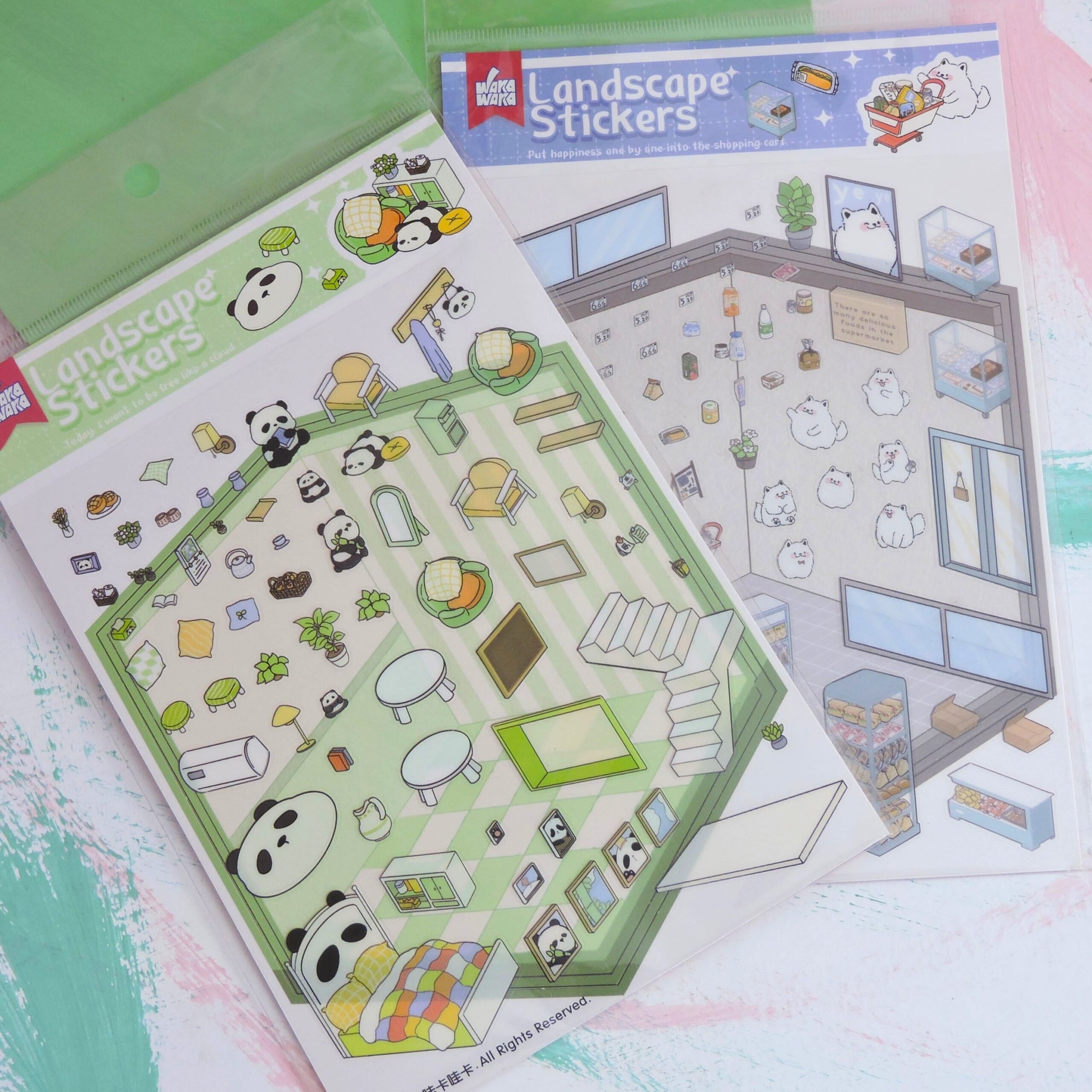 ¡Crea tu propio mundo en miniatura! Estos sets de Landscape Stickers incluyen un fondo ilustrado y un montón de stickers pequeñitos para que decores como quieras: muebles, accesorios, plantitas y personajes adorables 🐼🐶.